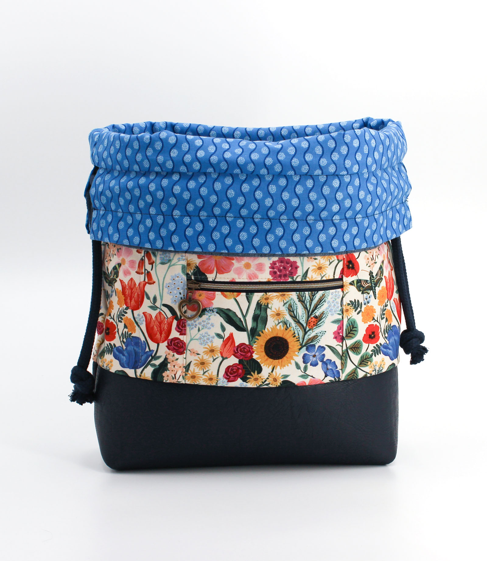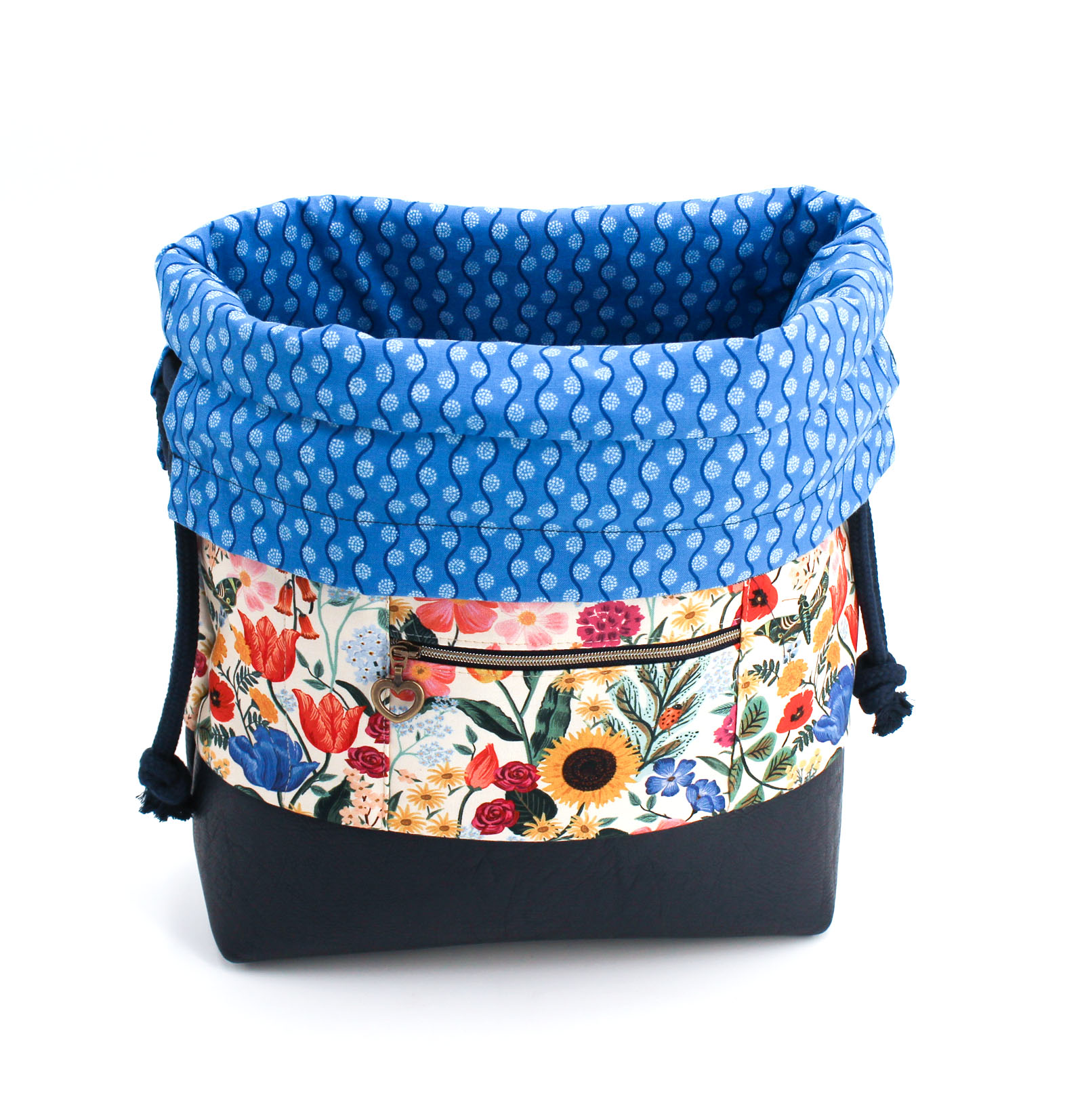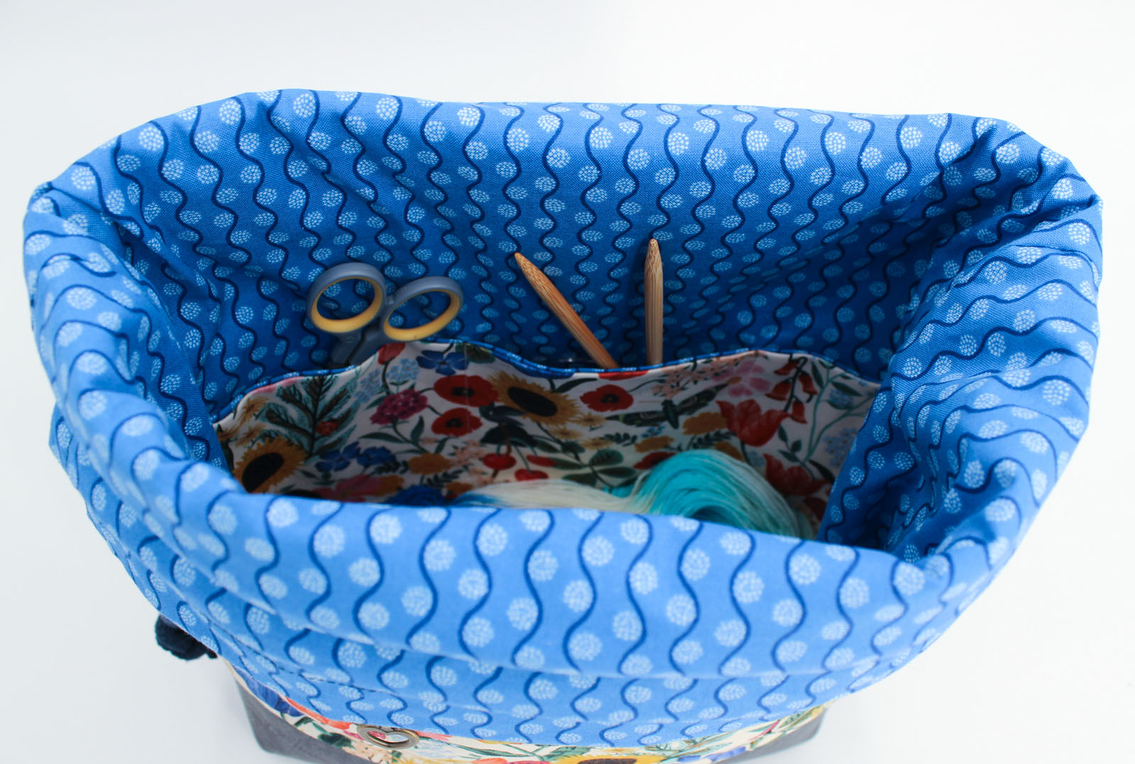 Entdecken Sie unsere praktische Projekttasche aus exquisiten Designer-Baumwollwebstoffen und hochwertigem Kunstleder – der ideale Begleiter für Strick- oder Häkelprojekte.