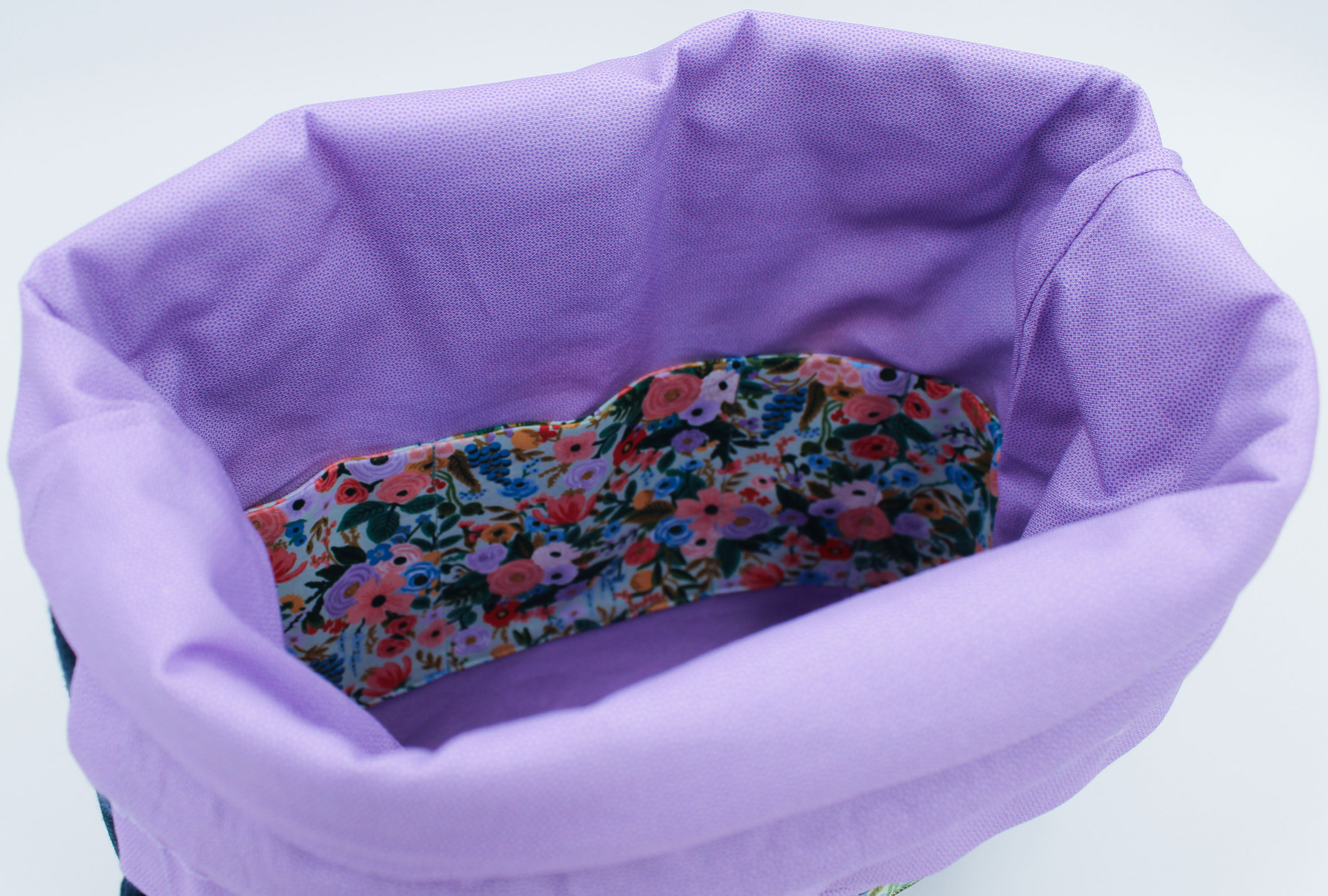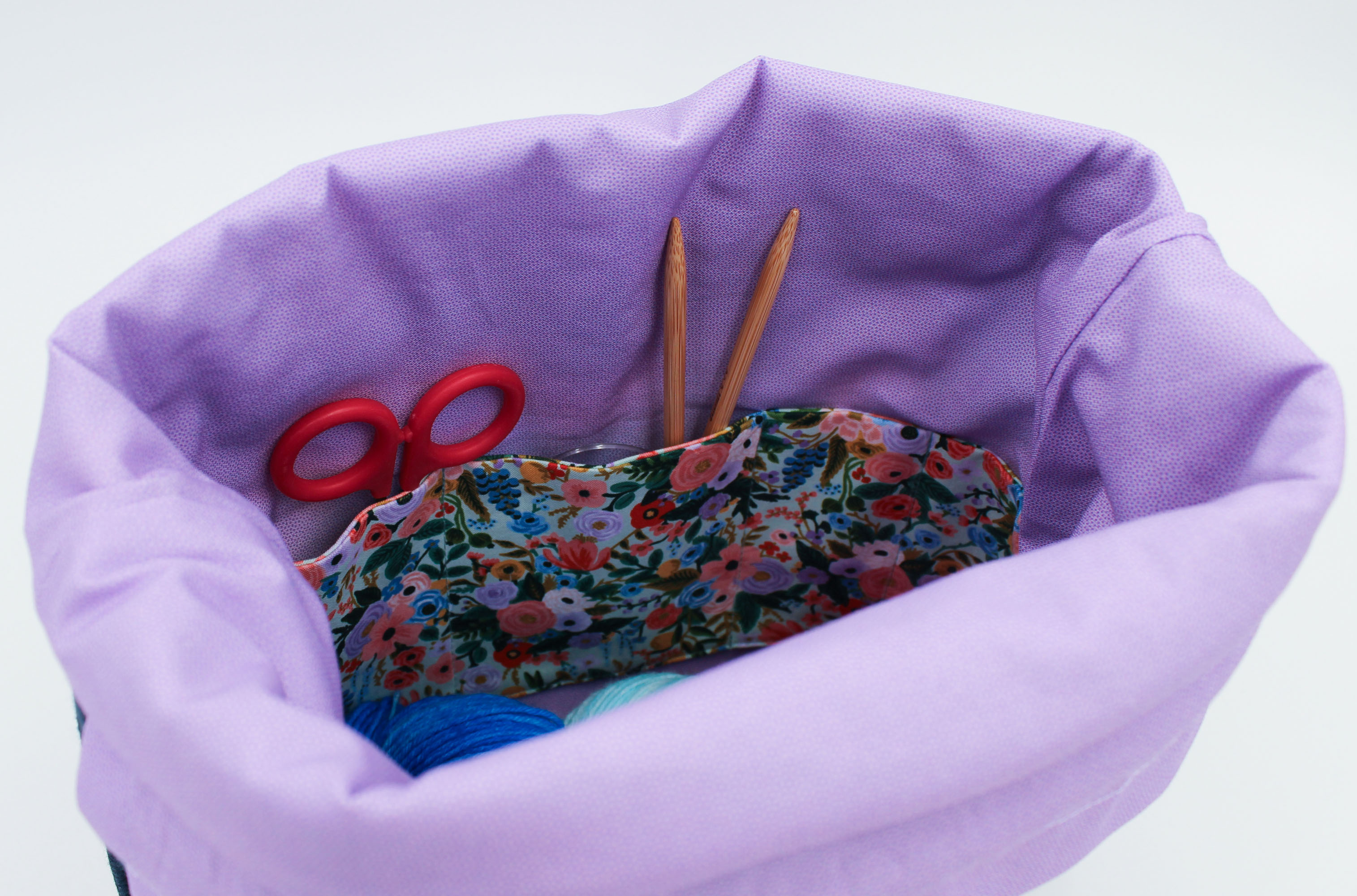 Entdecken Sie unsere praktische Projekttasche aus exquisiten Designer-Baumwollwebstoffen und hochwertigem Kunstleder – der ideale Begleiter für Strick- oder Häkelprojekte.
