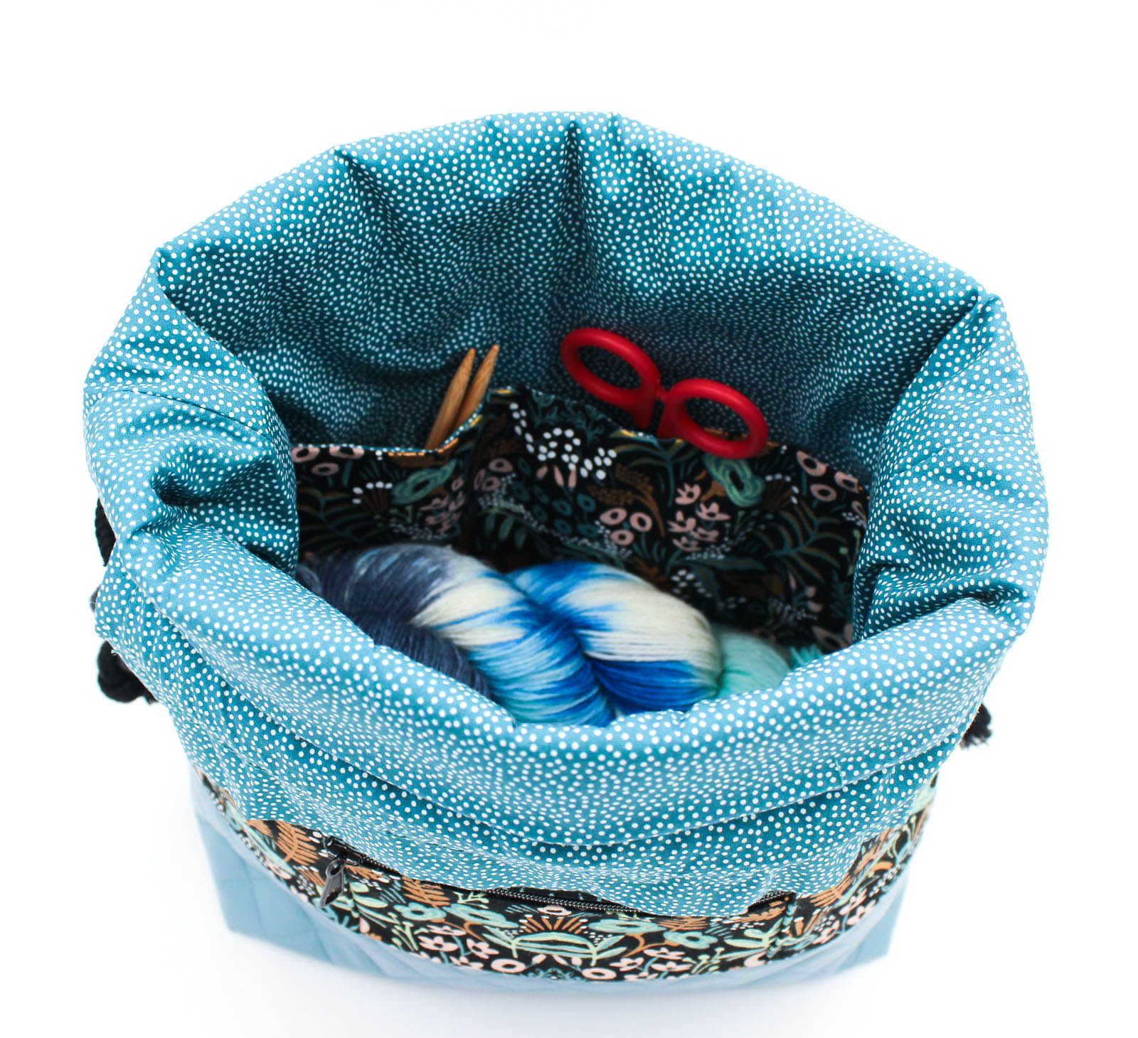 Der seitlich befestigte Tragegurt ermöglicht es, Ihre Handarbeit mühelos überall hin mitzunehmen. Außen befinden sich drei Steckfächer und ein kleines Reißverschlussfach für zusätzliche Organisation. Im Inneren bietet die Tasche genügend Platz für Wolle, und durch ein breites Steckfach an der einen Seite sind Schere, Strick- oder Häkelnadeln sowie ein Maßband ordentlich verstaut. Der praktische Kordelzug ermöglicht ein schnelles Verschließen und Öffnen der Projekttasche. Maße: - Höhe: ca. 37cm