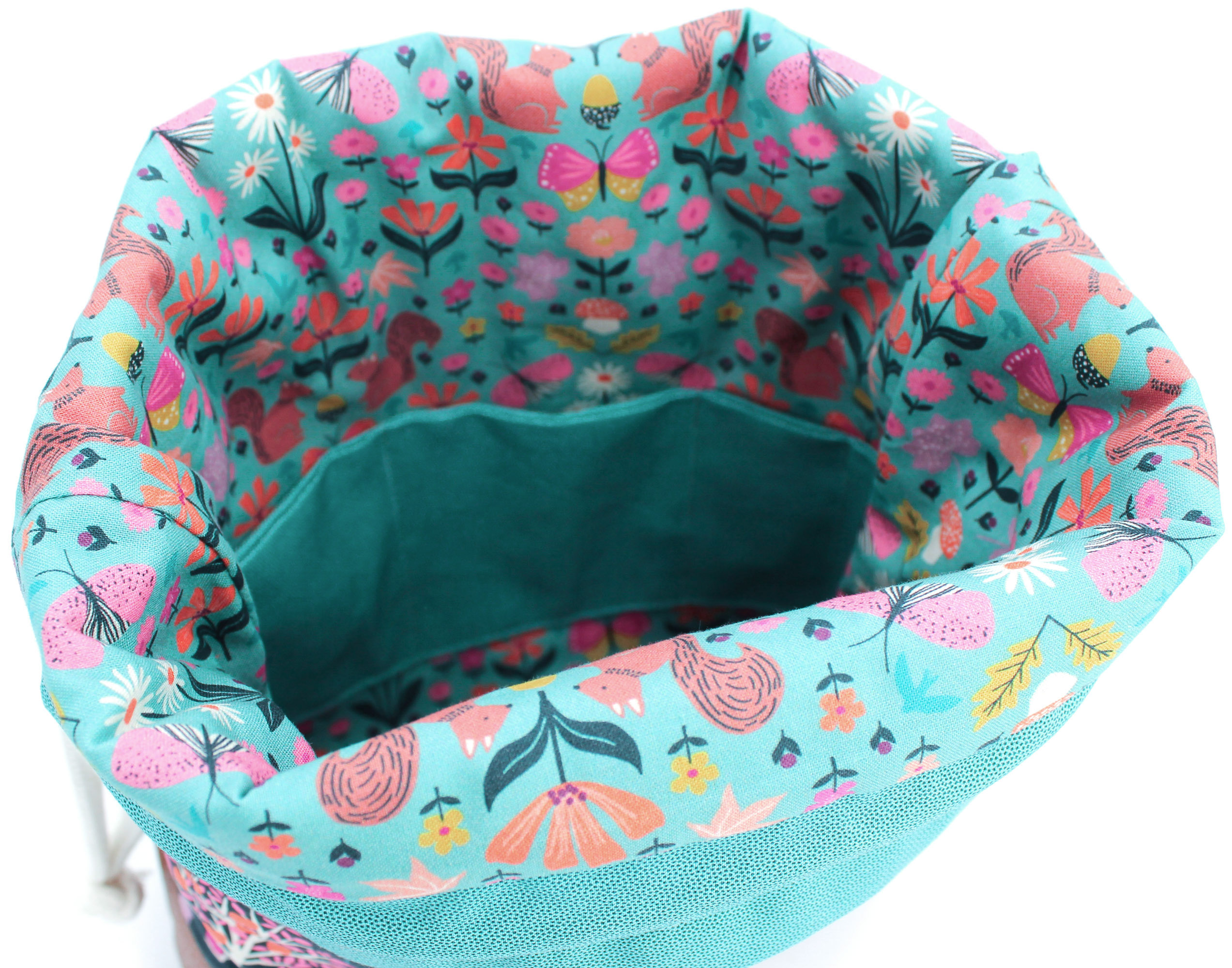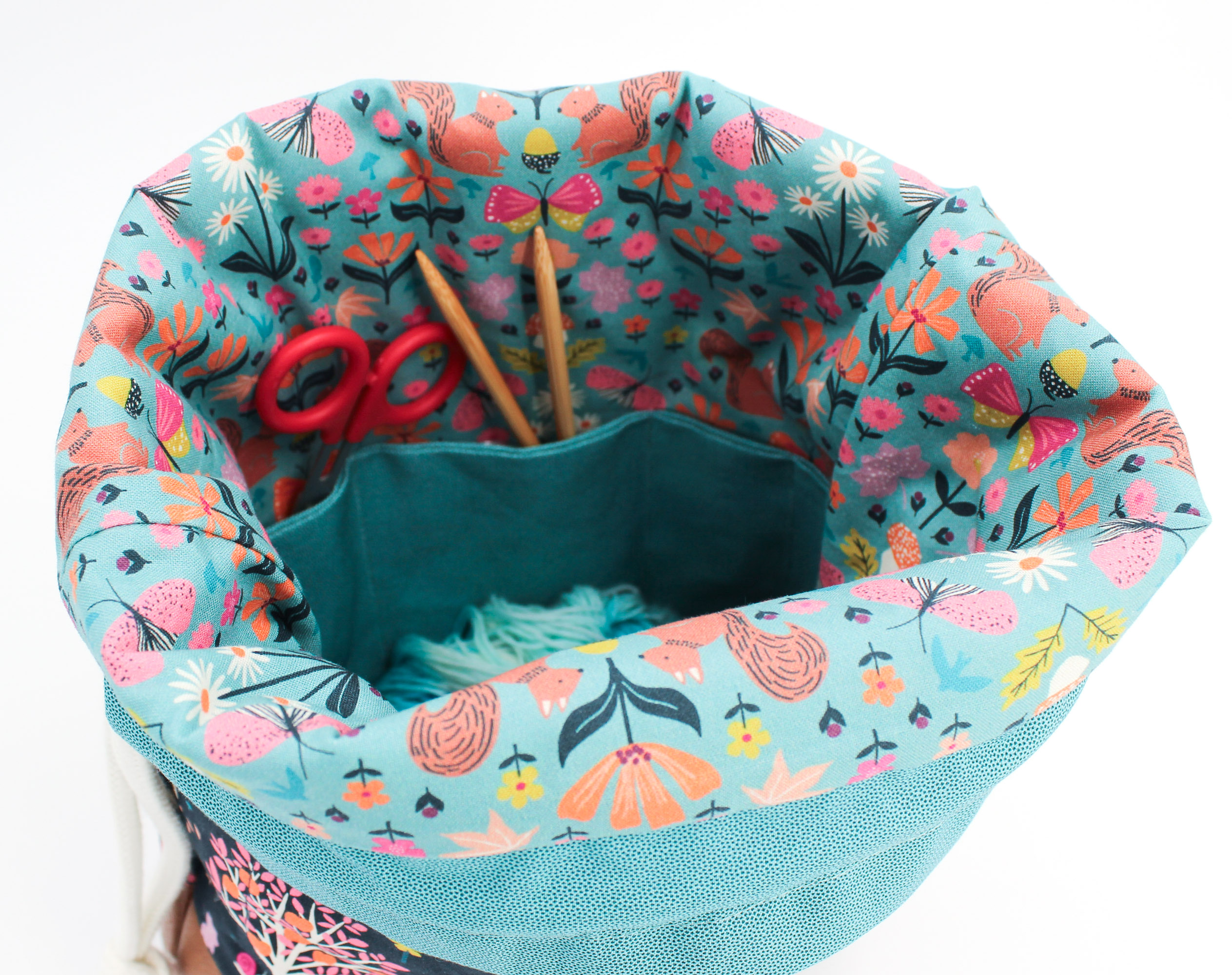 Entdecken Sie unsere praktische Projekttasche aus exquisiten Designer-Baumwollwebstoffen und hochwertigem Kunstleder – der ideale Begleiter für Strick- oder Häkelprojekte.