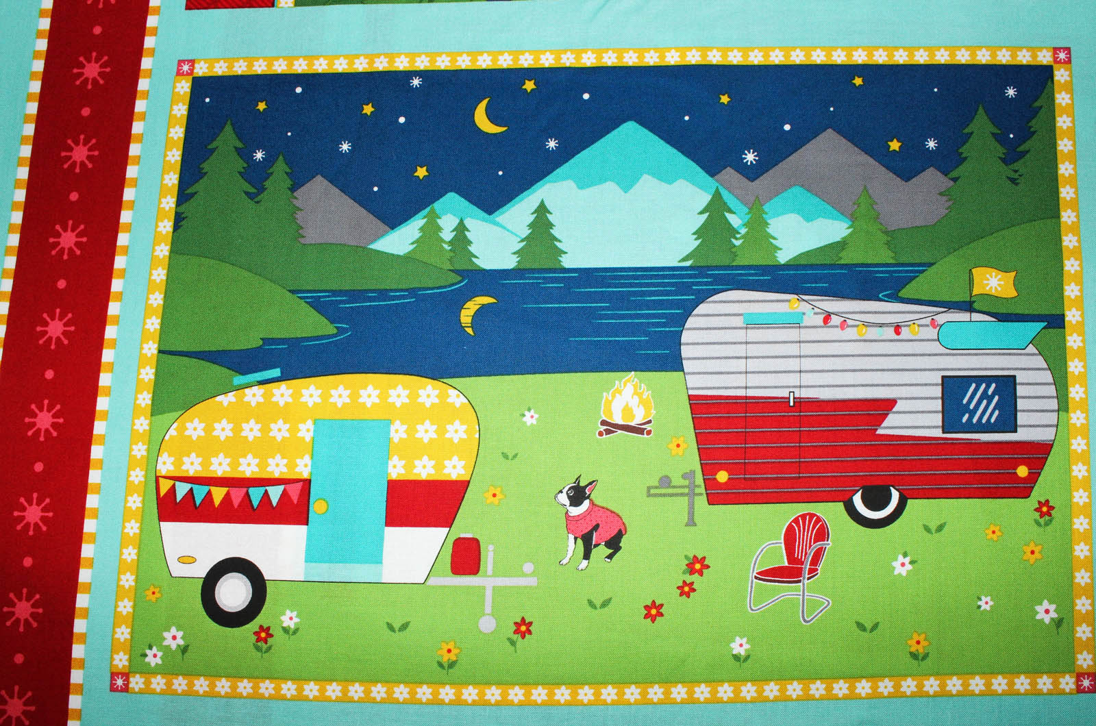 Hochwertiger Designerbaumwollwebstoff "Gone Glamping" aus dem Hause Michael Miller. Ein ganz besonderer Stoff für Campinliebhaber. Der Stoff wird im Rapport von ca. 58 cm Länge geliefert. Aus diesem Stoff können Platzdeckchen oder Kissen genäht werden. Ein Rapport besteht aus 4 Bildern und einer englischen Anleitung für Platzdeckchen, die seitlich auf den Stoff gedruckt wurde. (Foto 2)