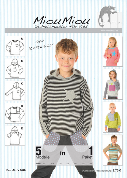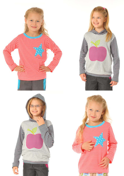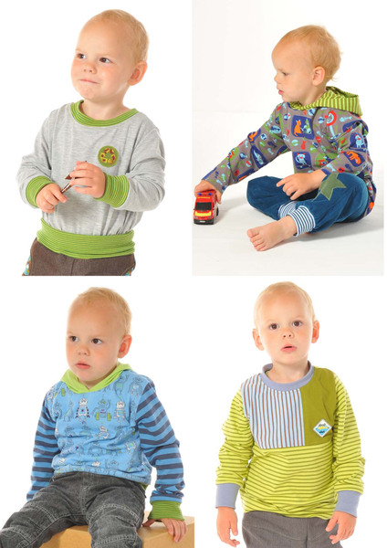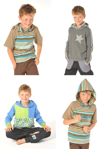 Das vielseitige Schnittmuster für Shirts Jonte & Jelle hat gleich 5 Varianten zu bieten: Basic-Shirt mit Halsbündchen, Basic-Shirt mit Kapuze, Shirt mit Kapuze und Ärmelstreifen, Shirt mit asymmetrischer Aufteilung im Vorderteil (toll für Resteverwertung!) und das Shirt mit "falschem" Raglan (für den Raglaneffekt werden die kleinen Passen aus dem gleichen Stoff wie die Ärmel eingesetzt).Das Tolle: Der Schnitt funktioniert wie ein Baukastensystem... wahlweise können Halsbündchen oder Kapuze, langer oder kurzer Ärmel, Saumbündchen oder glatter Saumabschluss am Ärmel ausgesucht werden... alles passt, alles ist möglich, nur der Gestaltungswunsch zählt!