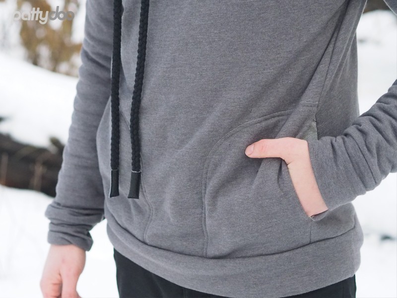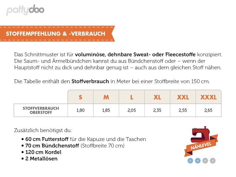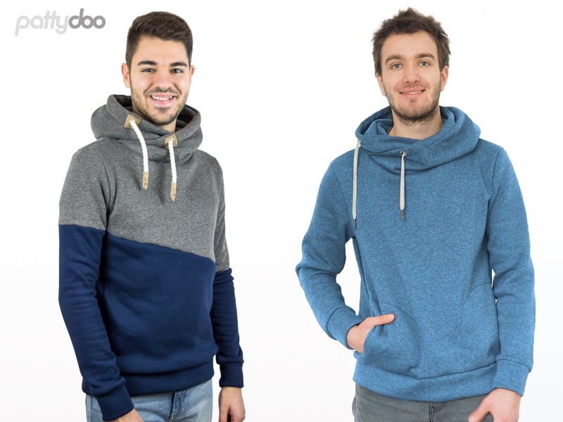 Das pattydoo Schnittmuster „Tony“ für die Größen S bis XXXL kannst du aus flauschigen Sweat- oder Fleecestoffen zu einem kuscheligen Kapuzenpullover nähen! Die gefütterte Kapuze in angesagter Wickeloptik kannst du mit großen Ösen und Kordeln verzieren. Die Ärmel sind extra lang und wärmen mit Daumenlöchern in den Bündchen besonders gut. Die Seitennähte verlaufen schräg ins Vorderteil und beherbergen stilvoll die praktischen Eingriffstaschen. Zum Schnittmuster gibt es eine Videoanleitung, so dass auch Anfänger das Shirt erfolgreich nähen können.