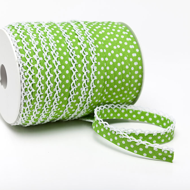 - hochwertiges Schrägband (1 m) hellgrün, mit weißer Häkelborte und weißen Punkten gefalzt