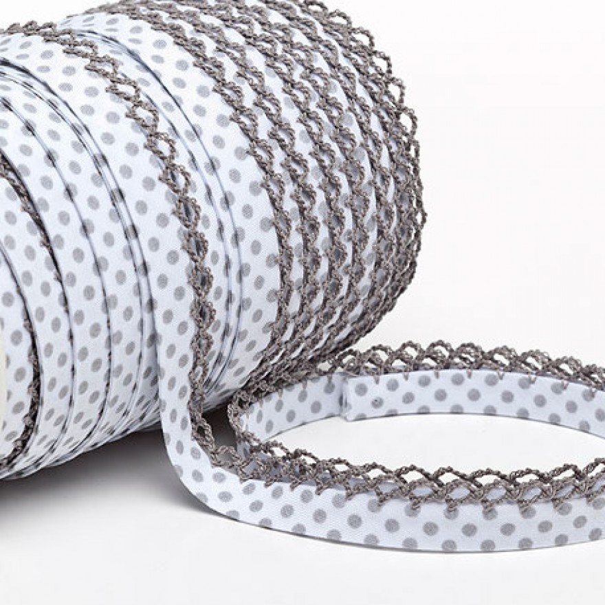 Produkt: Schrägband Häkelborte weiß mit grauen Punkten