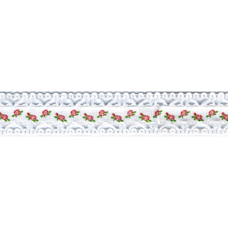 Romantische Spitze mit einem Ripsband in weiß mit Röschen. Ideal geeignet für romantische Verzierungen an Bekleidung, Homedeko und sonstige Accessoires.Material: 100 % Polyester
