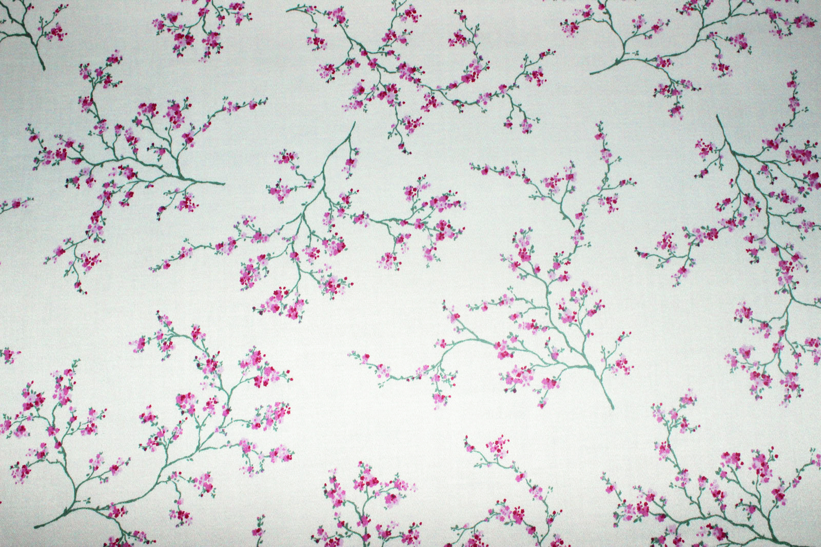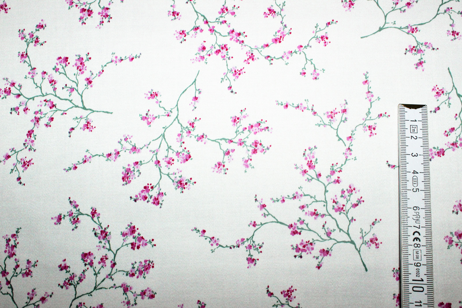 Hochwertiger, feinfädiger Stretch-Baumwollstoff  "Asia Fleur" in einem warmen Weißton mit Blütenzweigen und zarten Blüten aus dem Hause Hilco. Super geeignet um sich tolle Kleider, Röcke, Blazer, Jacken o.ä. daraus zu nähen.