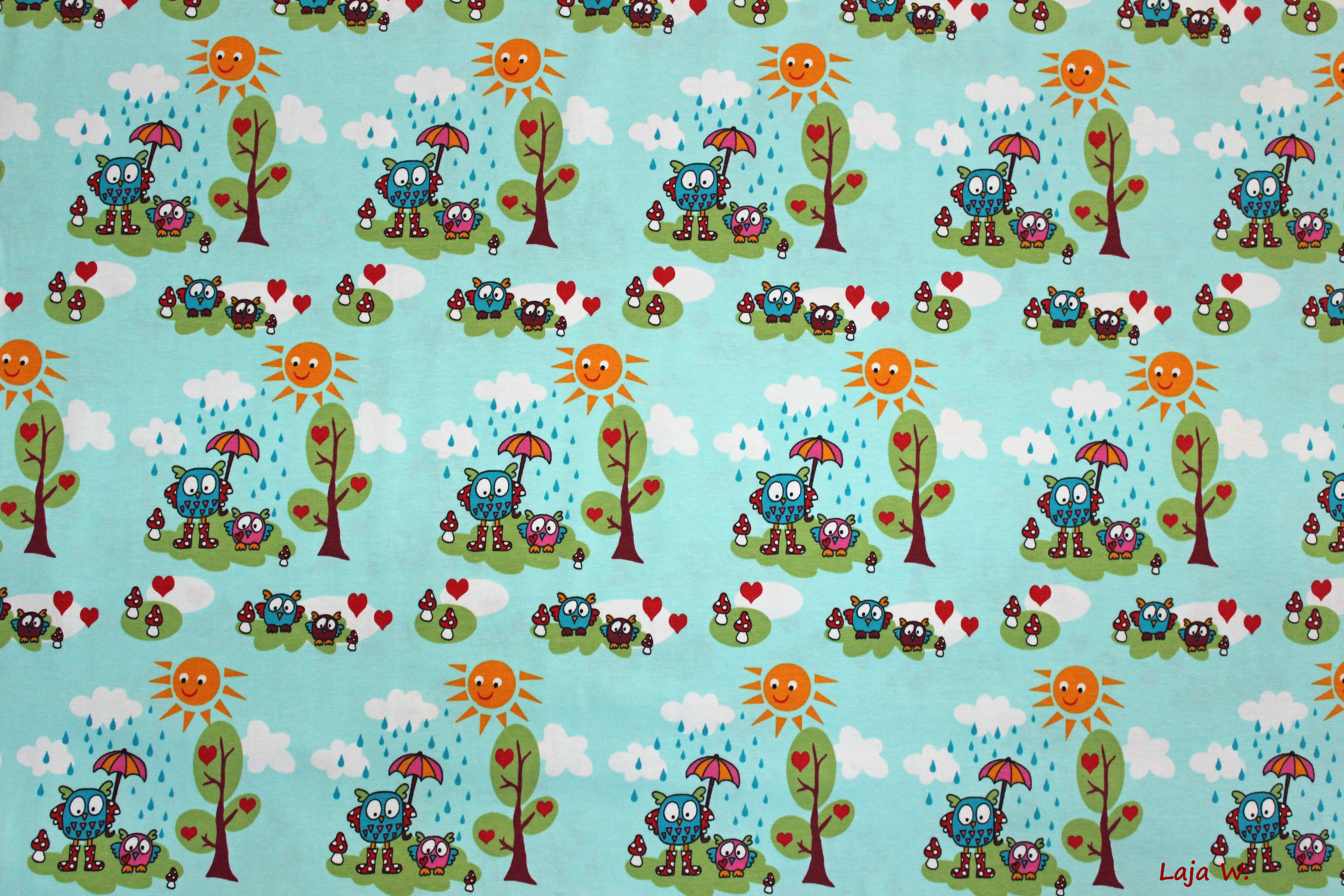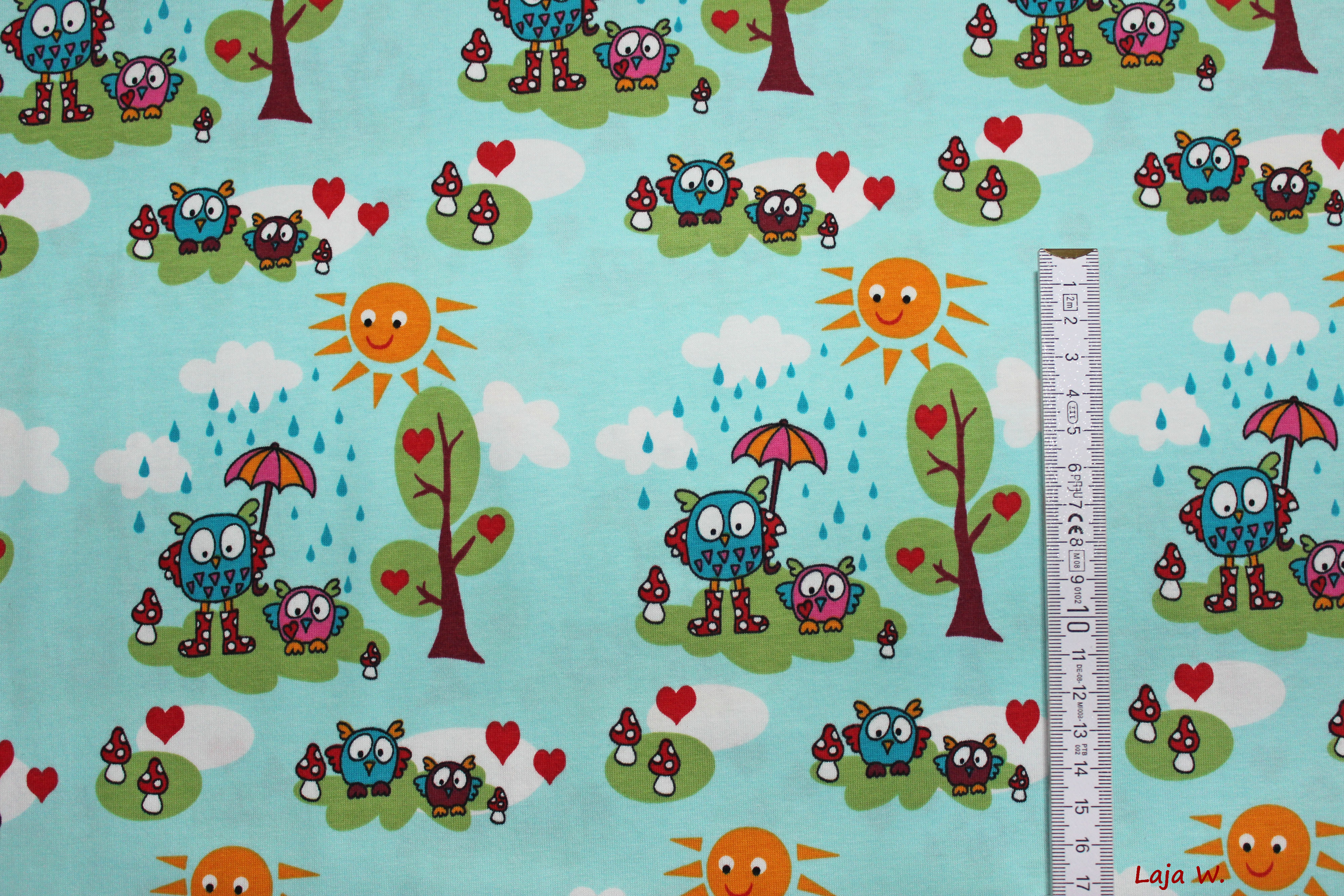 usw.Hier biete ich Euch einen absolut traumhaften Stretch-Jersey mit süßen Eulen in der Farbe türkis nach dem Design von Janeas World an.