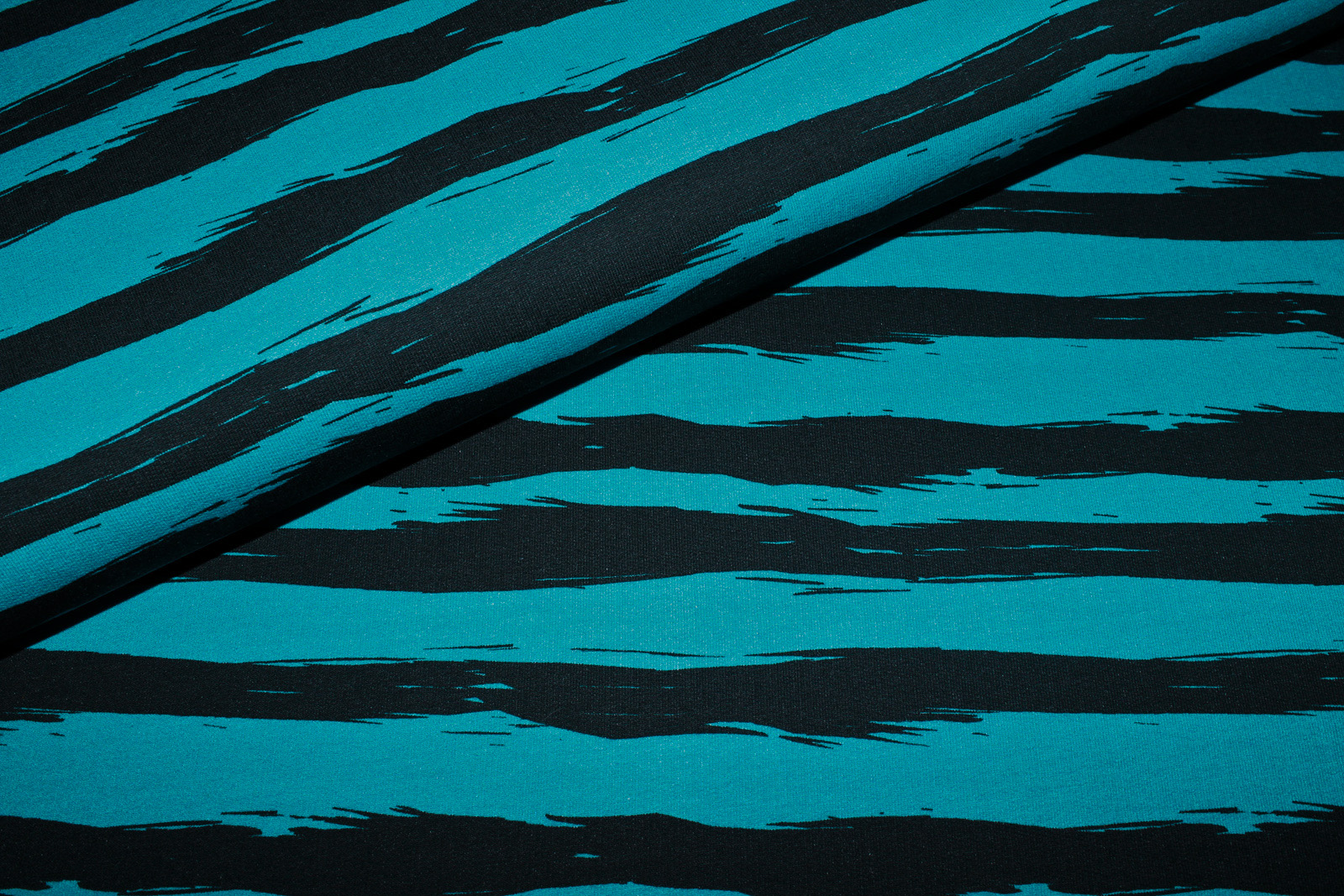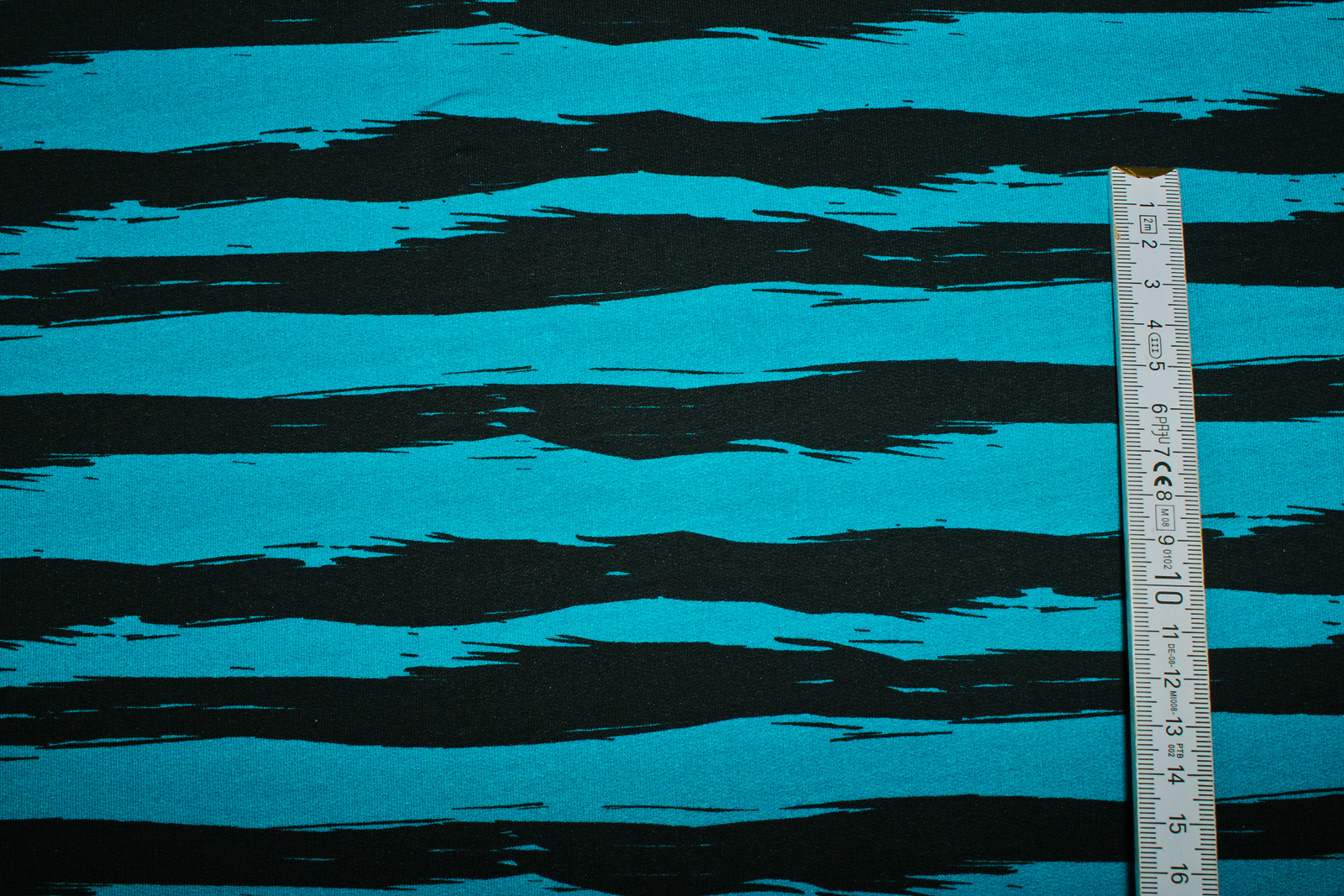 Hier biete ich Euch einen hochwertigen und trendigen ganz leichten Sweat "Pingu Stripe" Desgin von Petra Laitner mit einer leicht flauschigen Rückseite der Firma Hilco an. Der Stoff ist schwarz/ türkis gestreift. Die Dicke ist fast mit einem Jersey zu vergleichen.