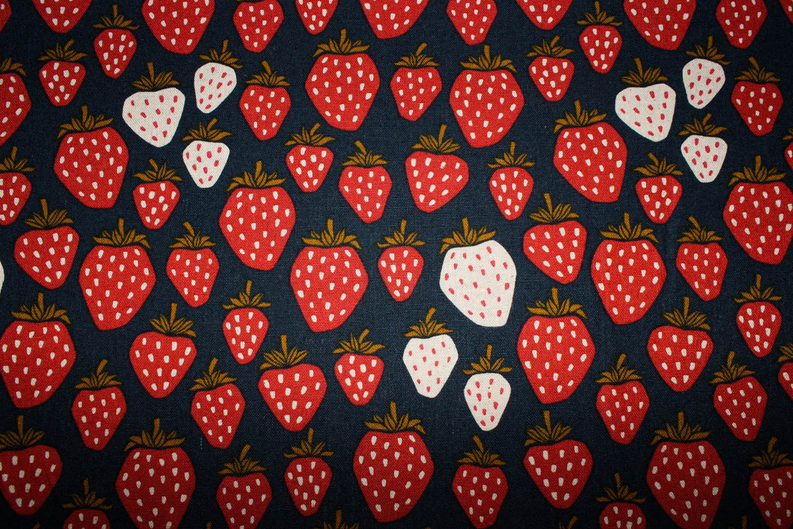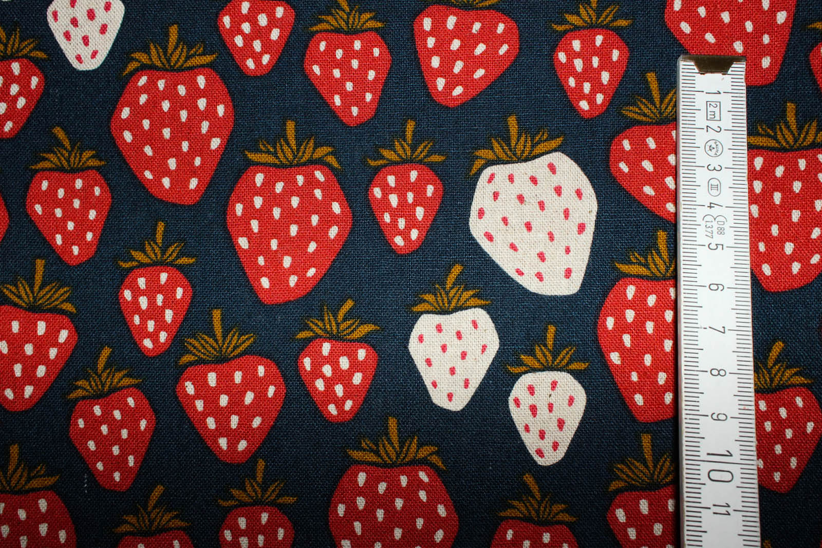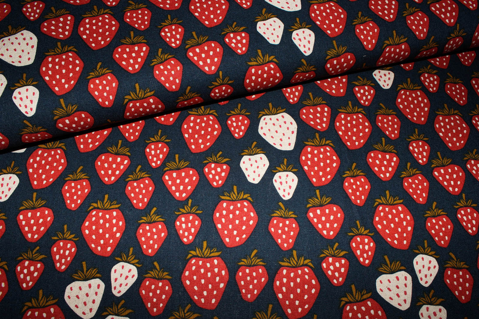 Wunderschöner robuster und ausgefallener Taschenstoff/ Canvasstoff/ Dekostoff "Queen of Berries" von Cotton and Steel aus der Serie "Under the Apple Tree" by Loes van Oosten /Rifle Paper Co. mit Erdbeeren auf nachtblauem Untergrund. Durch die Robustheit ist der Stoff super für Taschen, Rucksäcke, Geldbörsen, Kissen und sonstige Homedeko geeignet.