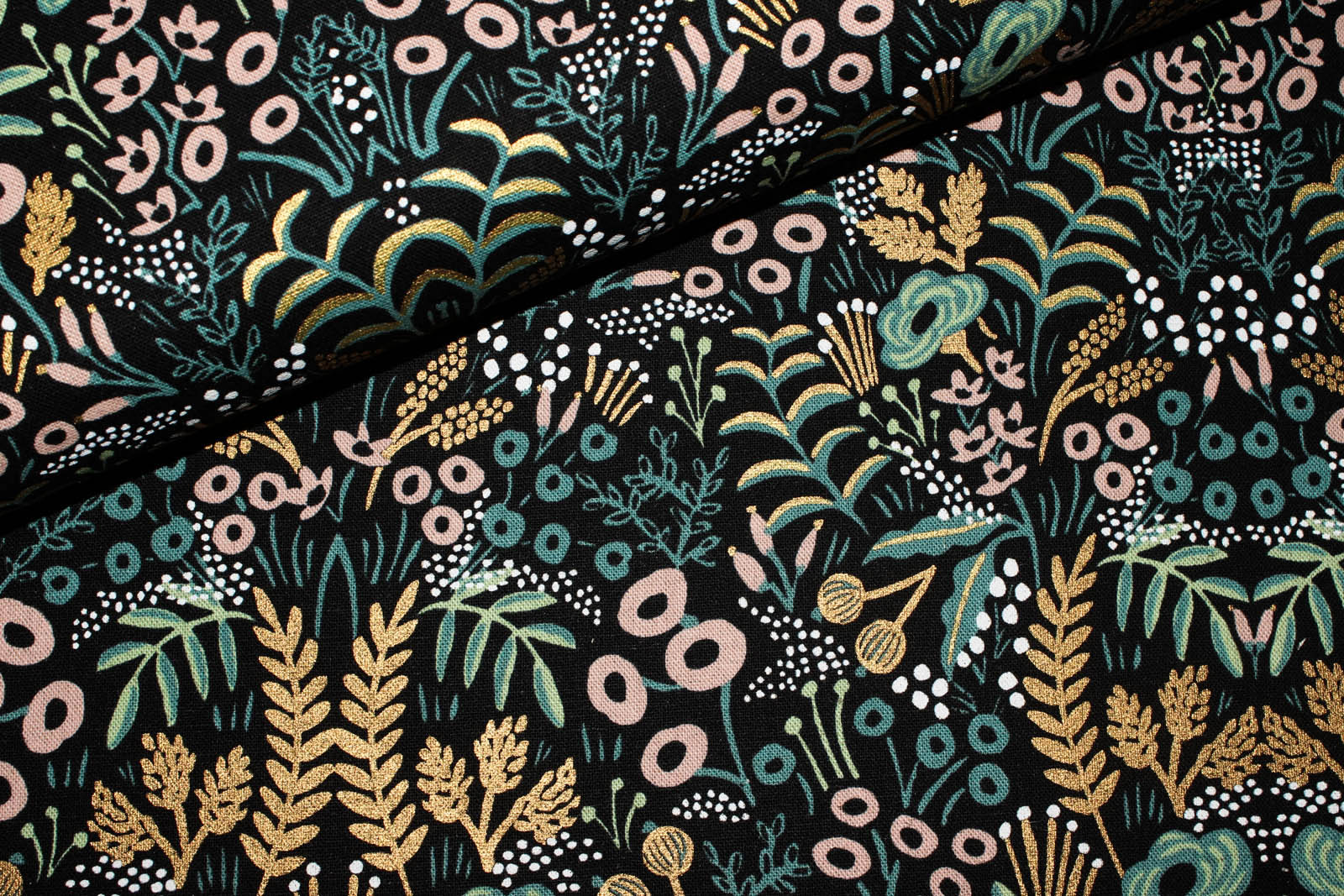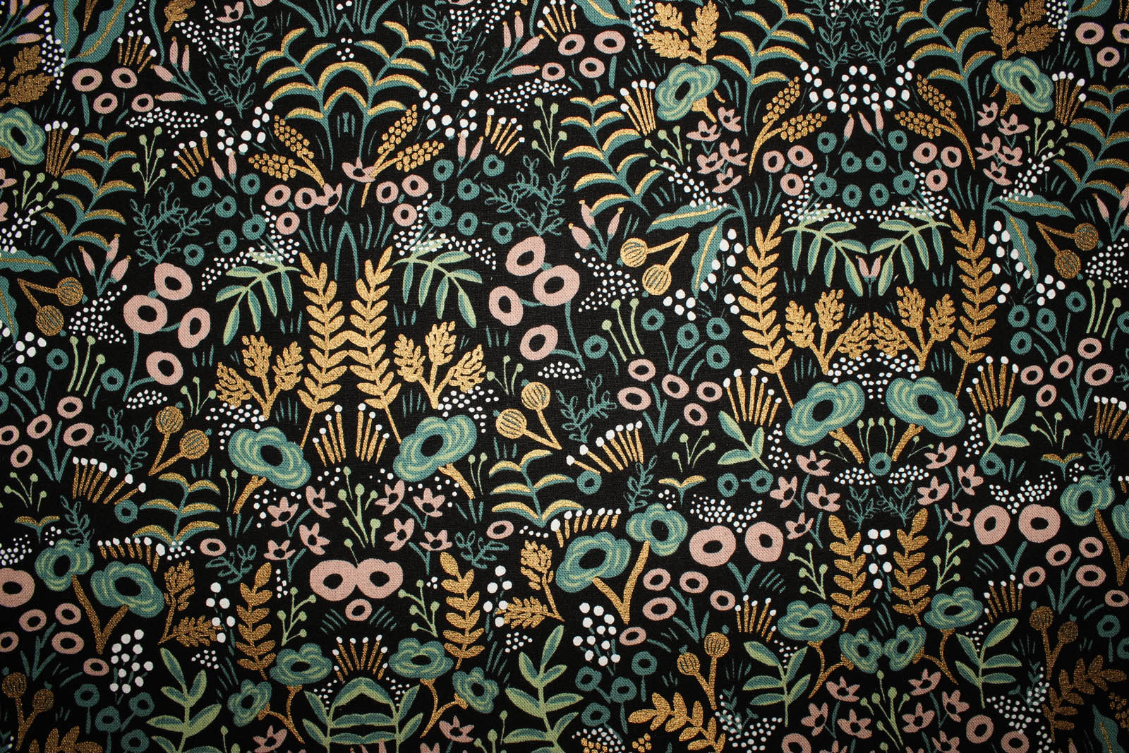 Wunderschöner robuster und ausgefallener Taschenstoff/ Canvasstoff/ Dekostoff "Tapestry" von Cotton and Steele aus der Serie "Menagerie" by Anna Bond/Rifle Paper Co mit Metallic- Akzenten. Der Untergrund ist schwarz Durch die Robustheit ist der Stoff super für Taschen, Rucksäcke, Geldbörsen, Kissen und sonstige Homedeko geeignet.