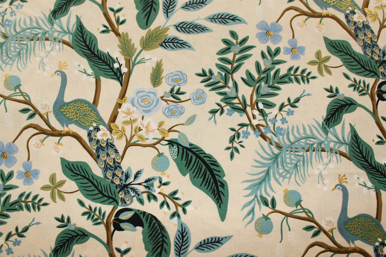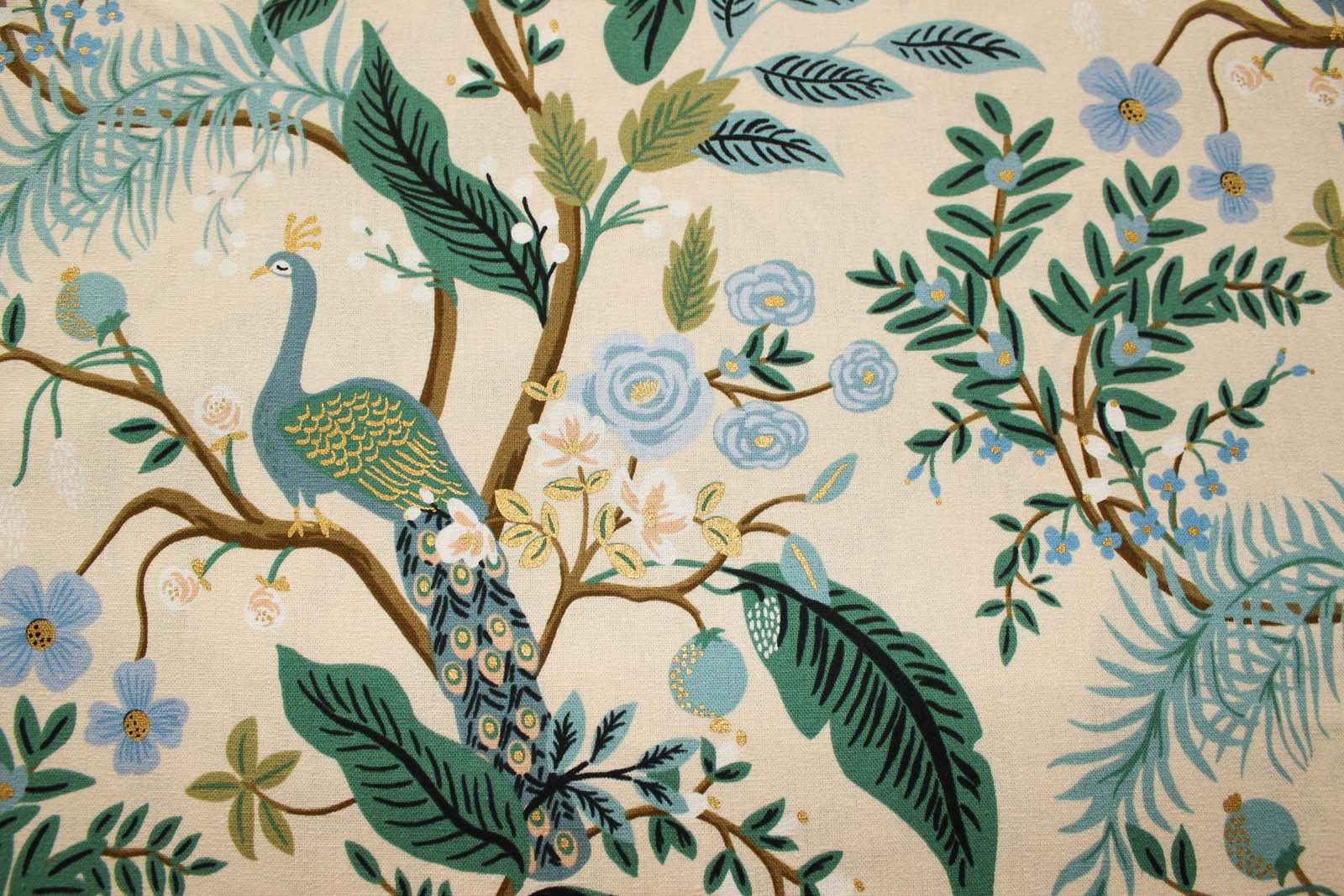Wunderschöner robuster und ausgefallener Taschenstoff/ Canvasstoff/ Dekostoff "Vintagev Garden" von Rifle Paper Co. mit Blumen,Blättern und Pfauen auf naturfarbenem Untergrund, mit goldfarbenen Metallic- Akzenten. Der Pfau hat eine Größe von ca. 18,5 cm. Durch die Robustheit ist der Stoff super für Taschen, Rucksäcke, Geldbörsen, Kissen und sonstige Homedeko geeignet. Stoffe und Nähzubehör auf dem fünften Foto gehören nicht zum Angebot, sondern dient der Inspiration.