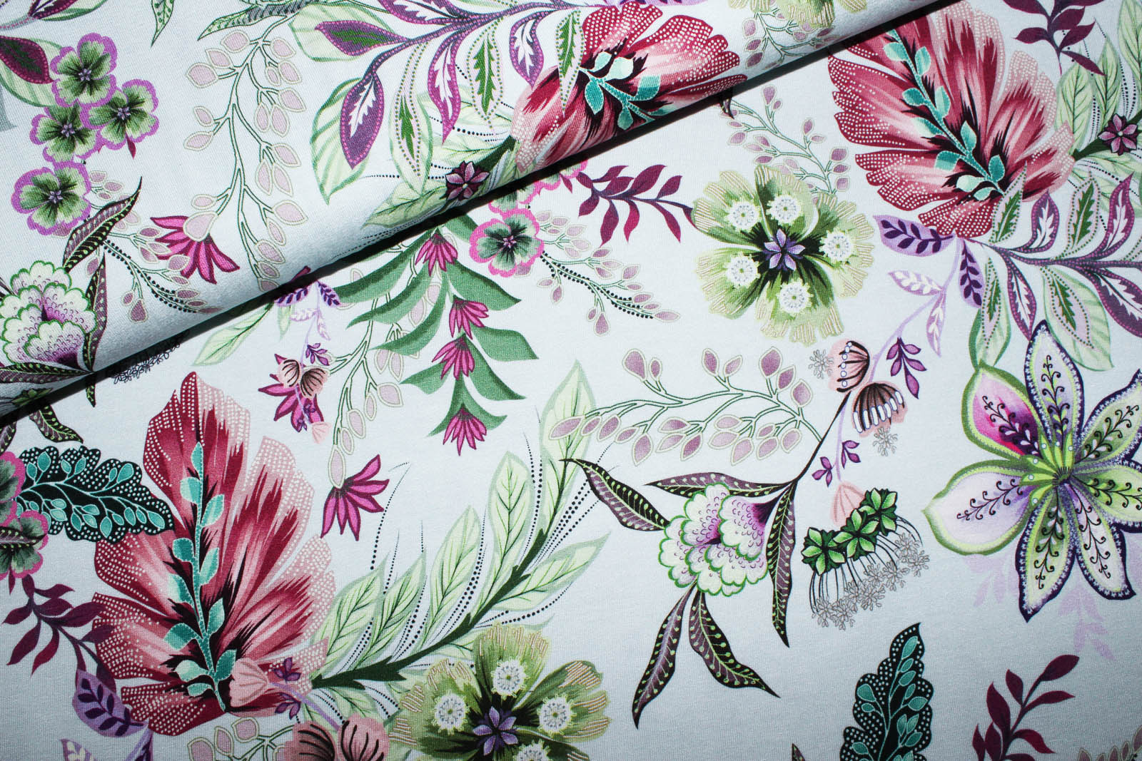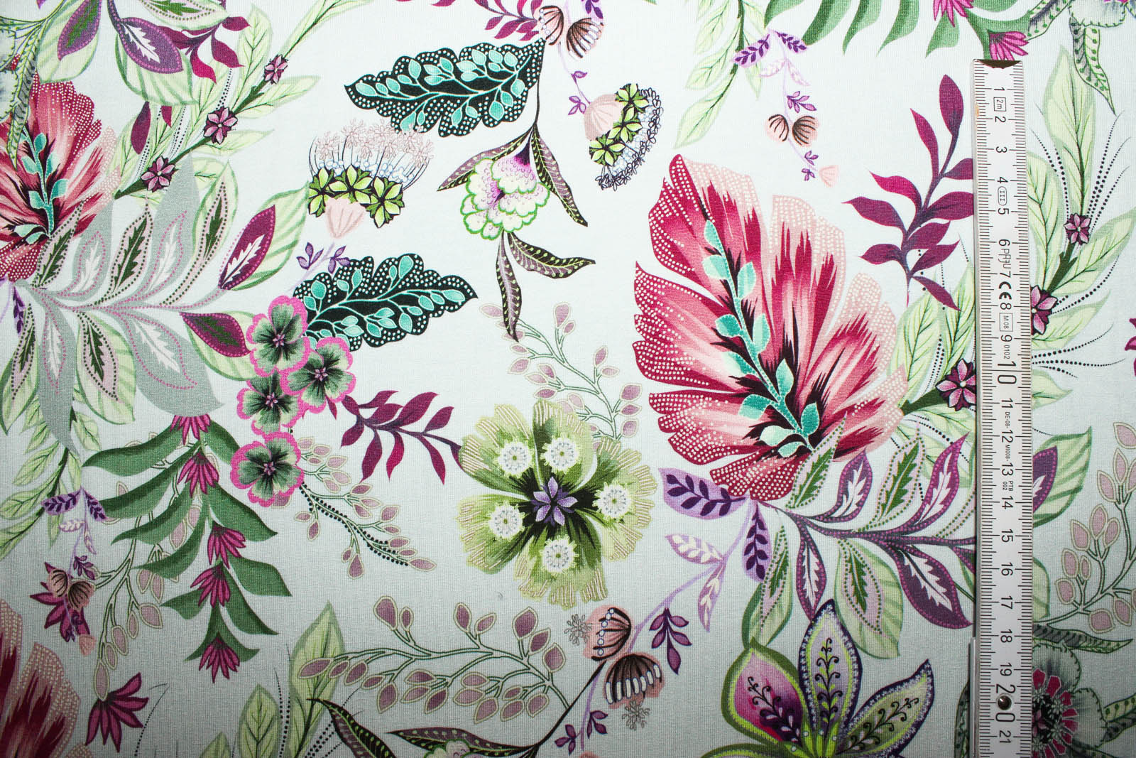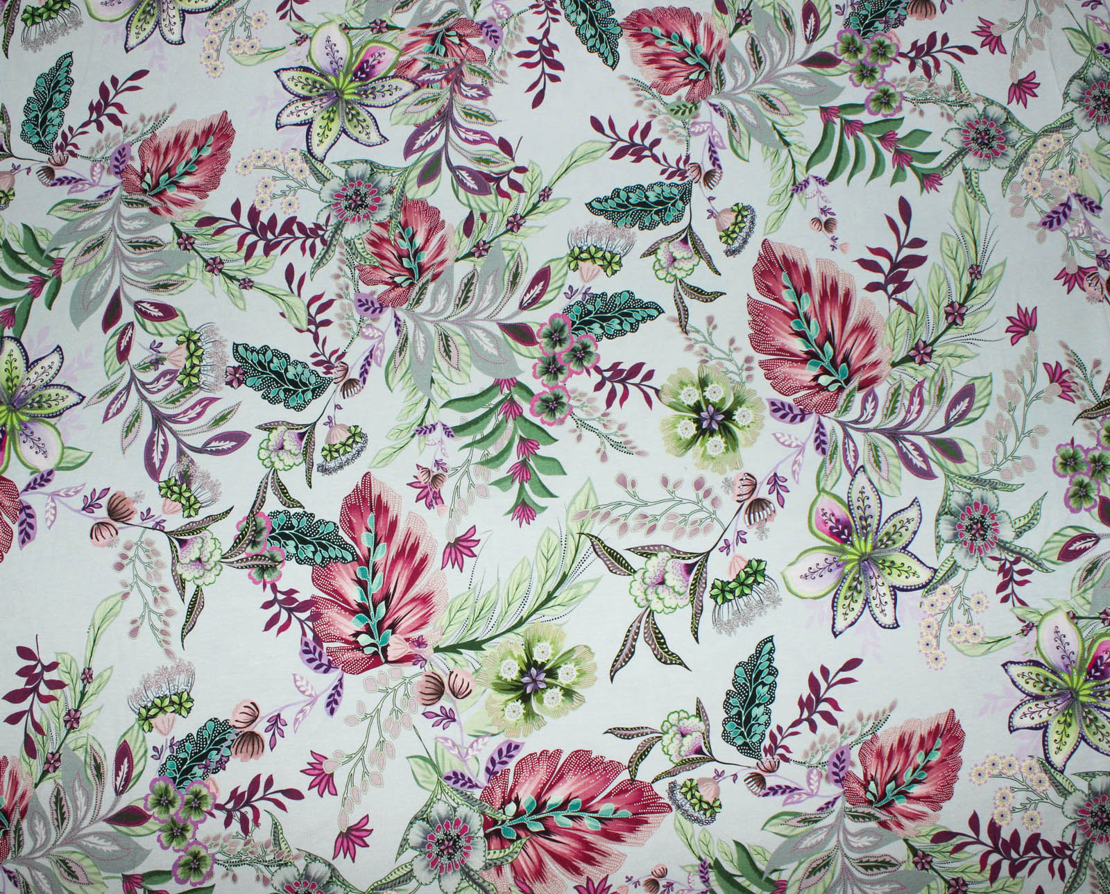 Hier biete ich Euch einen hochwertigen und weichfallenden digital bedruckten Viskosejersey mit einem floralen Muster der Firma Hilco an. Der Untergrund ist ein ganz dezenter gedeckter Aqua-Ton. Dieser Viskose-Jersey eignet sich für feine Bekleidung wie Shirts, Kleider und ähnliches.