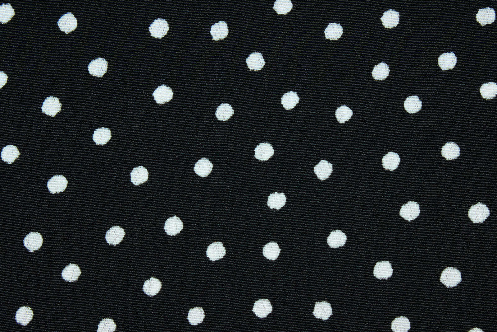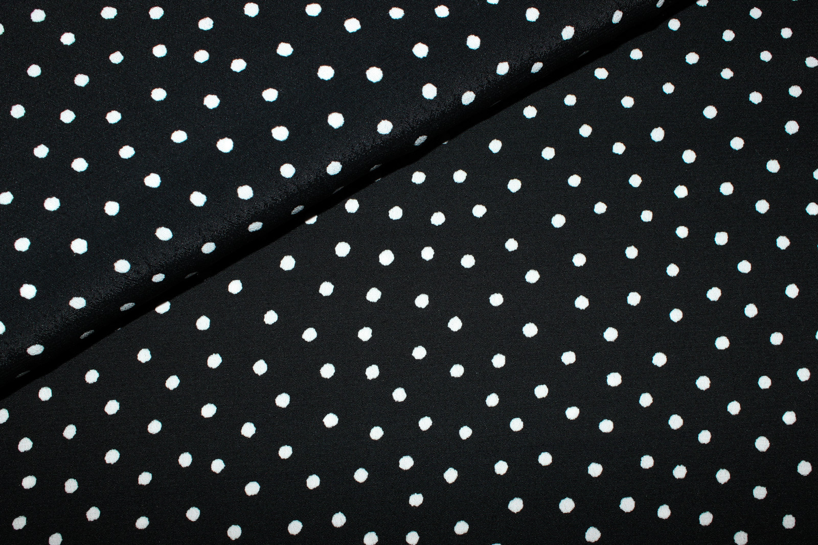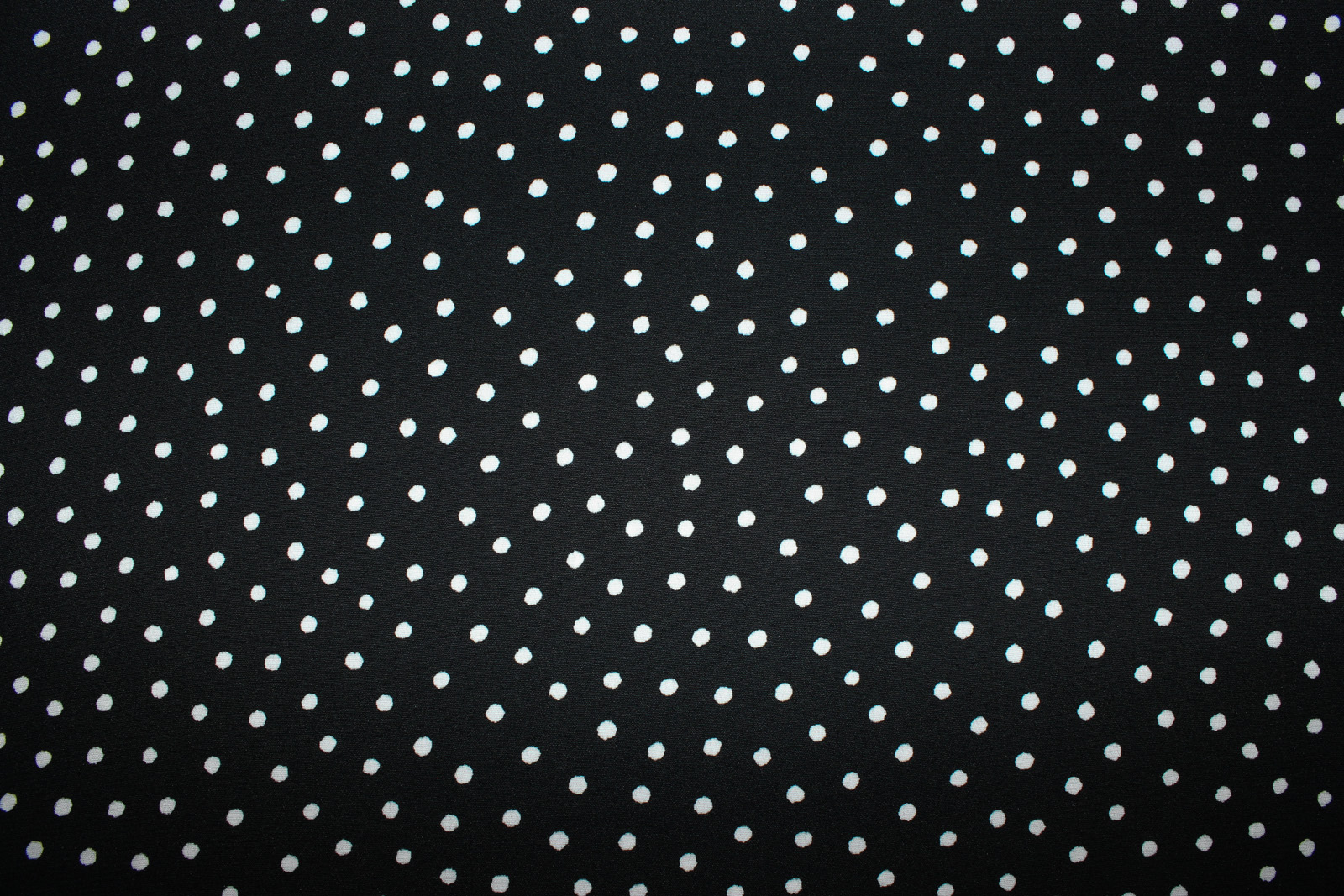 Hochwertiger, fließender Viskosechiffon mit leichter Kreppstruktur aus dem Hause Hilco. Unregelmäßige Punkte in gedecktem Weiß tummeln sich auf schwarzem Untergrund. Die Punkte haben eine Größe von ca. 5mm.