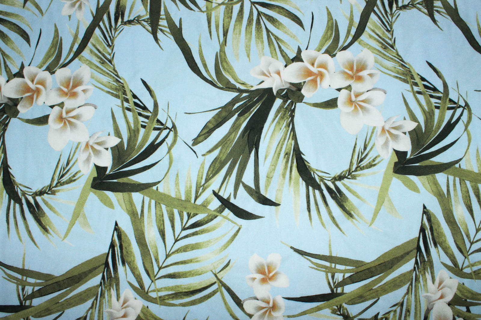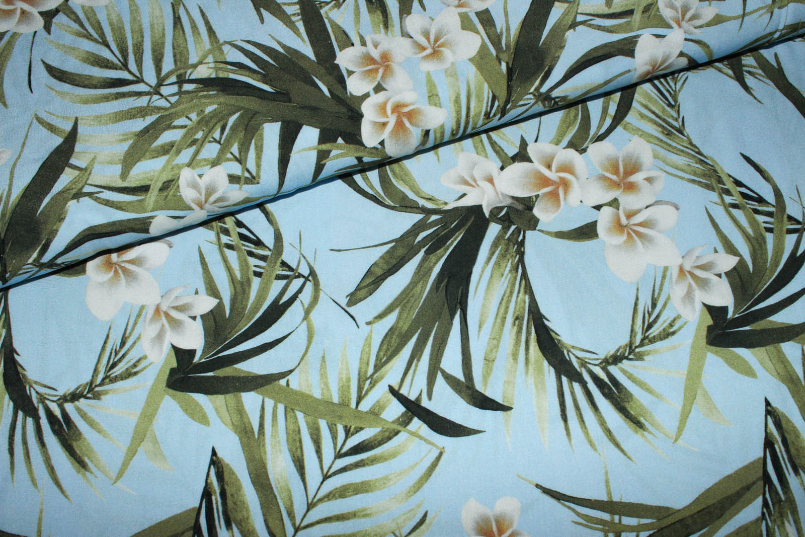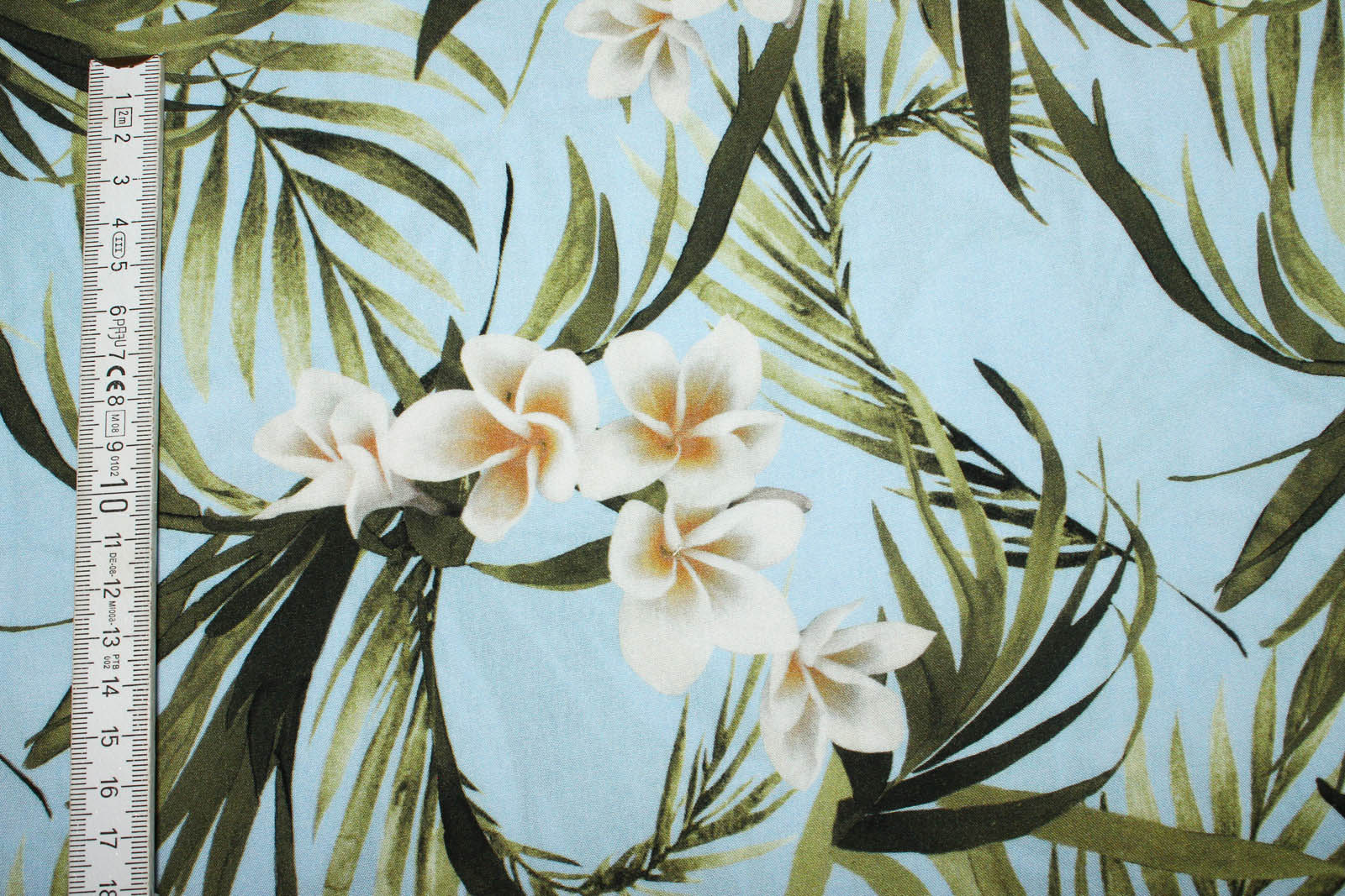 usw. Hochwertiger, weichfallender, seidiger Viskosedruck aus dem Hause Hilco mit Blumen und Blättern. Der Untergrund ist hellblau. Perfekt geeignet für Blusen, Tuniken, Schals und andere Accessoires.