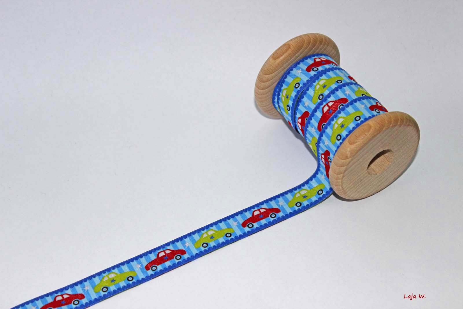 Wunderschönes Webband blau gestreift mit roten und grünen Autos.